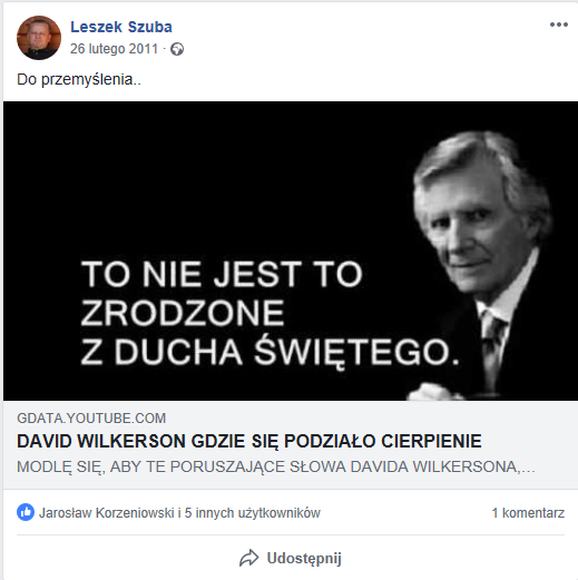Leszek Szuba – Dyrektor LBP link – reprezentuje KCHB i urzęduje w Tarnobrzegu. To „opiekun” zboru i „misjonarz” (zobacz link) promujący na swojej stronie fałszywego proroka Davida Wilkersona. Pan Leszek jest przekonany, że uczynił Jezusa swoim Panem, tym samym całkowicie zaprzecza suwerenności Bożej (Bóg jest Panem wszystkich, czy się to komu podoba czy nie). link